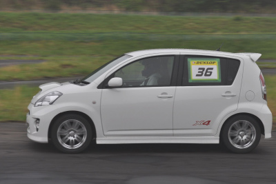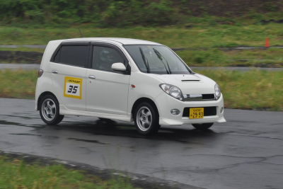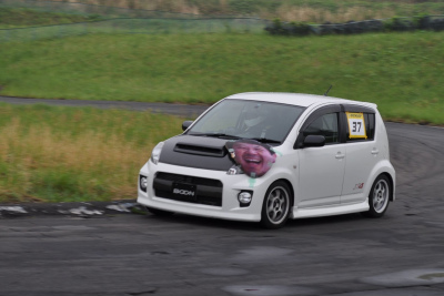会場に前日入りしてやる気マンマン! コースも走り倒してだいぶ官職をつかんできたゼッケン34番「SUMMIto」の「DXLエッセカスタムAT」。 ただし事前走行はドライ路面なんで、第1・2ヒートのウエット路面は未体験ゾーン?! 後半ヒートの食いつきが午前中から見られたら、もっと面白くなっただけに残念! おーとま!車でのモータースポーツ振興のため、競技にレースにと今後も活躍していくとの事。頑張れ! |