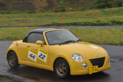今回一番意外だったのがOBクラス。 今年から「ダイハツ経験者」「ダイチャレ経験者」という枠を外して誰でも出場できるようにしたとはいえ、フタを開ければミニはいるしヴィッツはいるし、スイフトとカプチーノは去年に引き続きありがとう! で、ミニはどうやらクーパーでは無い模様・・「ミニ・メイフェア」の1300って奴ですか? しかし負けていられないのが昨年のGAチャンプ、ゼッケン41番の「いの」のヴィッツRS。 目立たないが最終ヒートのタイムを見ると、ドライなら面白い事になったのかも?!と頭角を現しつつあるZENのスイフトも面白い。 しかし雨で面白い事になっちゃったのが、ゼッケン42番「エリ〜ゼ」と同じく38番「蓮(はす)」の駆るカプチーノ。 どちらも一度はコース外に飛び出すアクシデントを乗り越えての完走。アシが硬いとどうしてもアンダーが・・ |