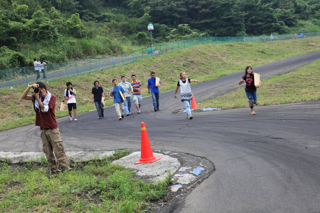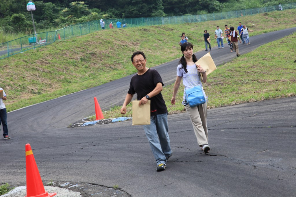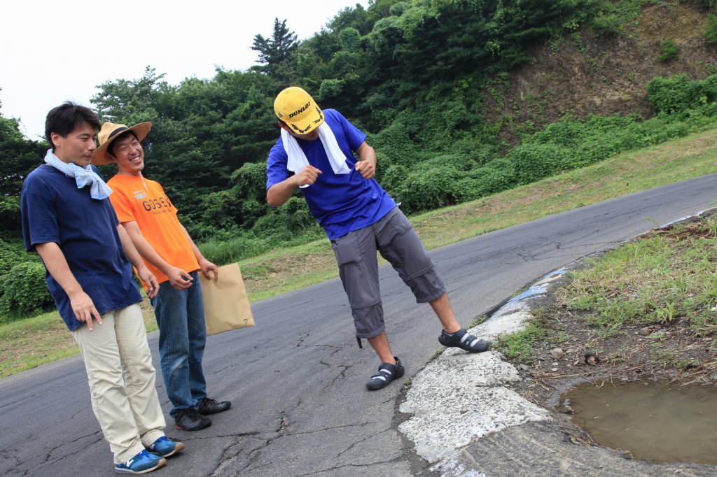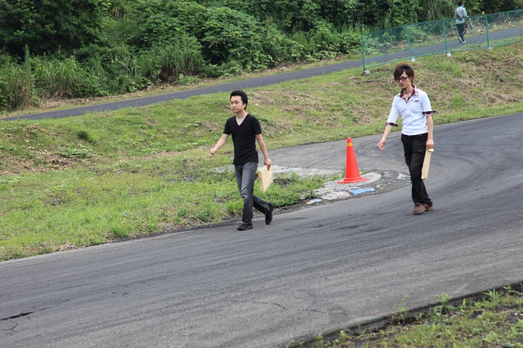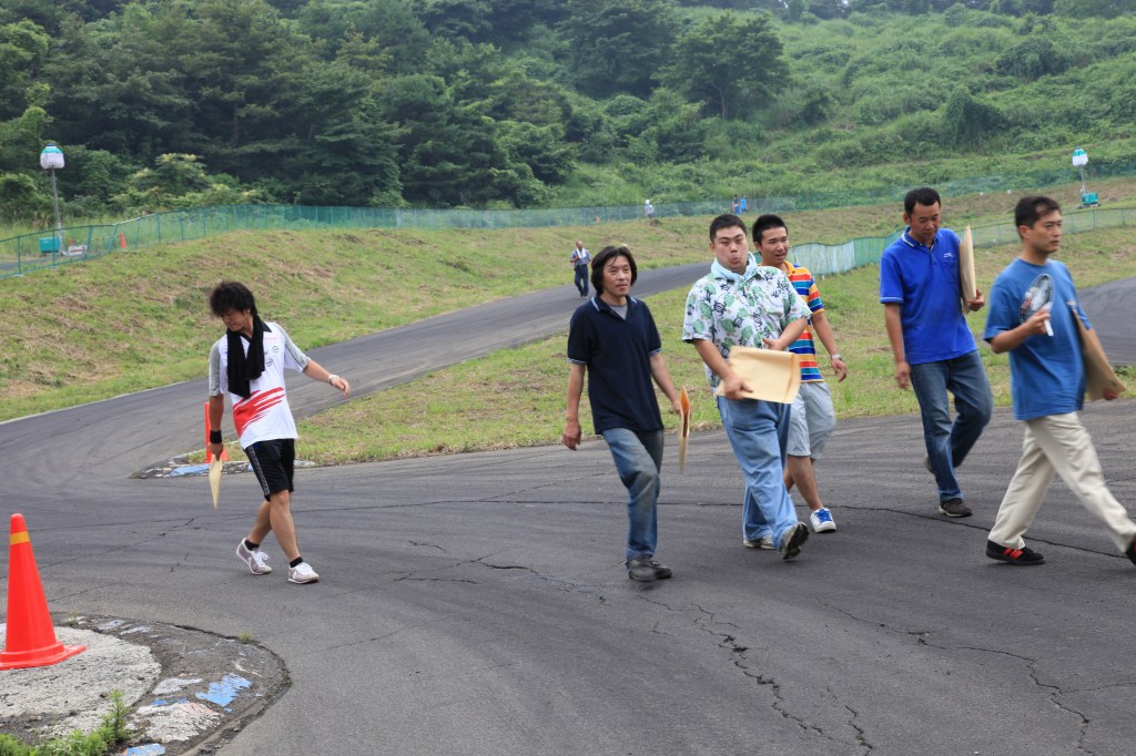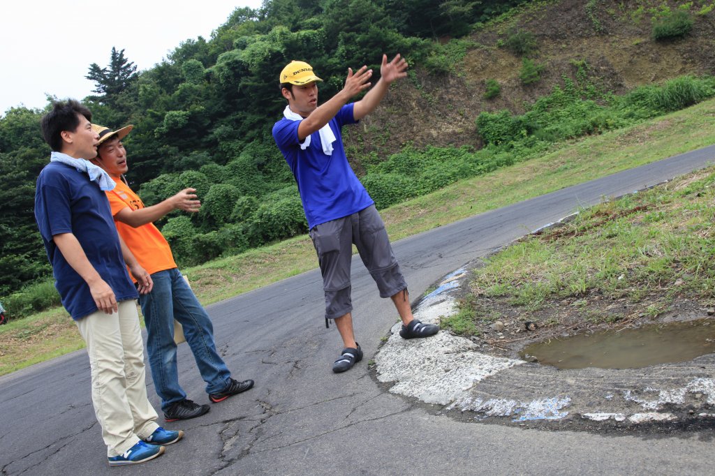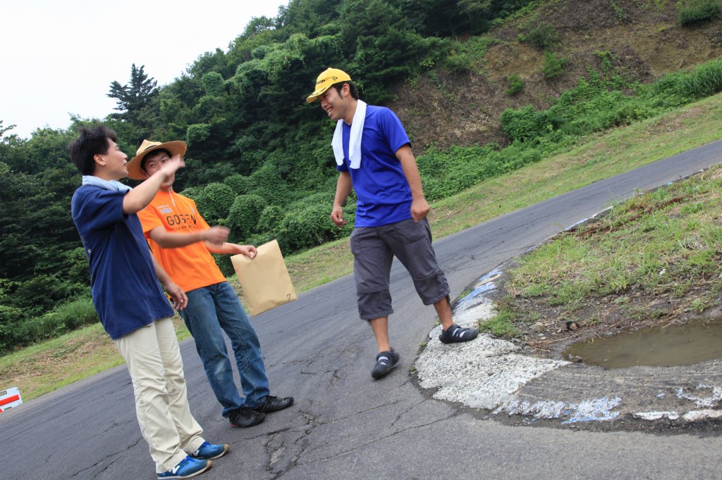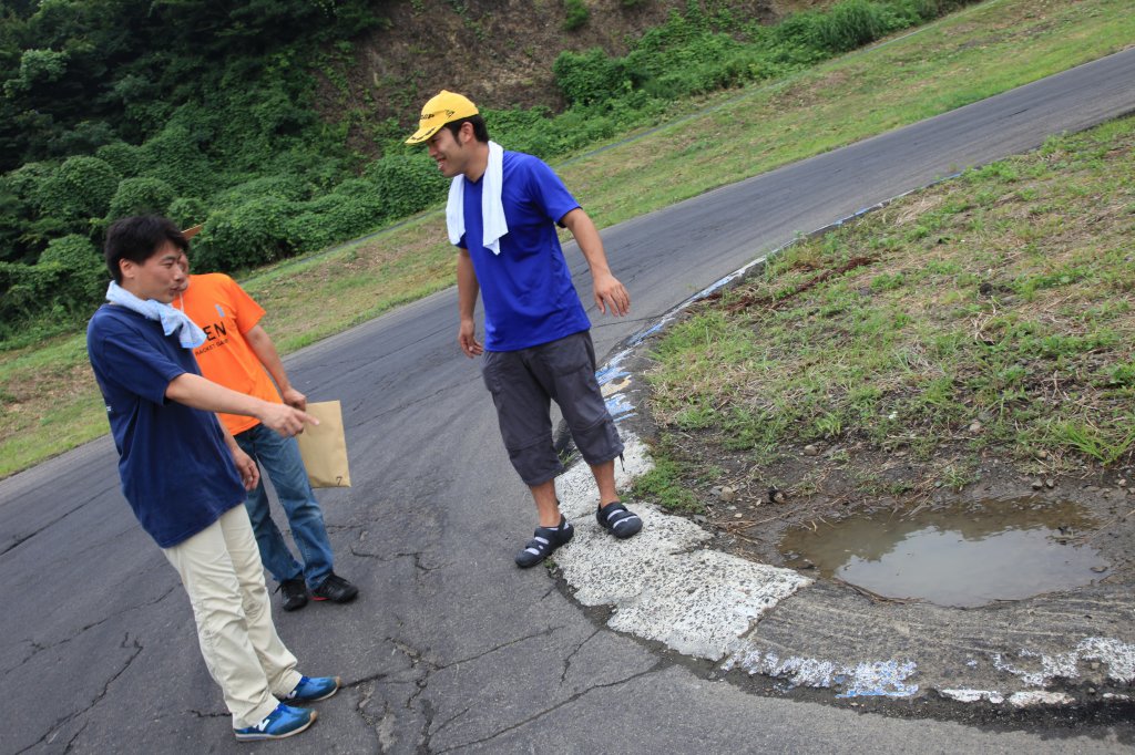 インフィールド入口の左ヘアピンで和やかに攻略法を話し合っているのは、黄色い帽子の関さん、オレンジのTシャツの浅野さん、紺色シャツのねこが重いさんのLNクラス3人。