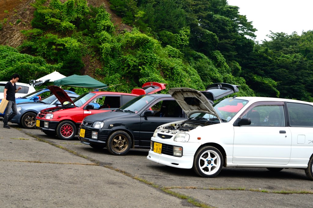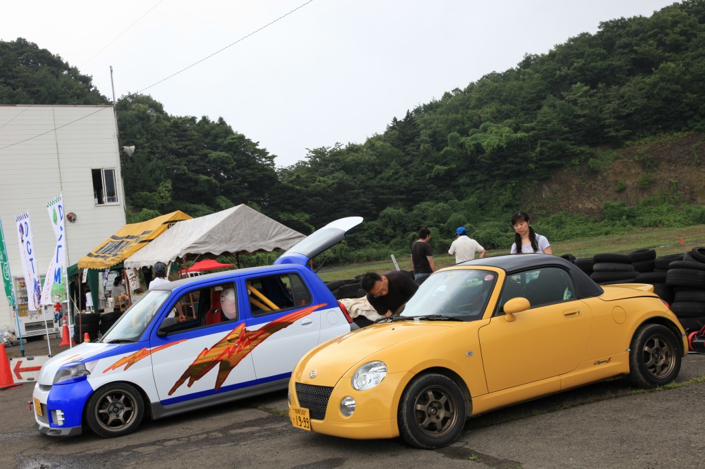 aquさん&みやこさんのコペンDTとミラ_ミラさんのコペンさん(右下)も面白くて、本来スポーツ用のDTが外見落ち着いた大人仕様なのに対して、どちらかというとGT志向のメタルトップのコペンさんはフロントグリルも外してやる気まんまん仕様。