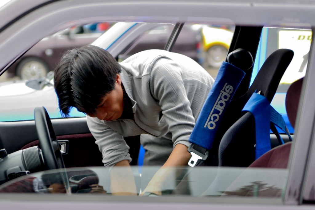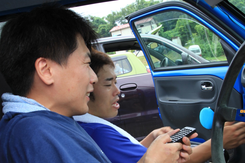 パドックでは、新規格NA軽自動車レース「東北660選手権」にも出場している、LNクラスの関さん(助手席)とねこが重いさん(運転席)が、車内のモニターで何やら上映中。