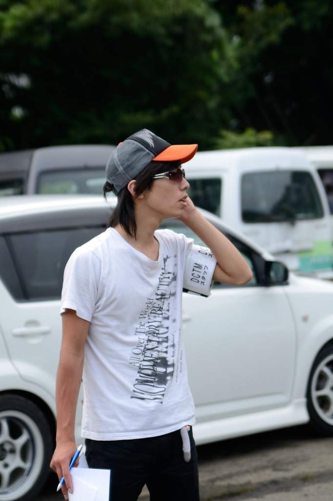 参加者のゼッケンを確認して呼び出ししたり、パドック側で車両の誘導を行うのが彼の役目です。