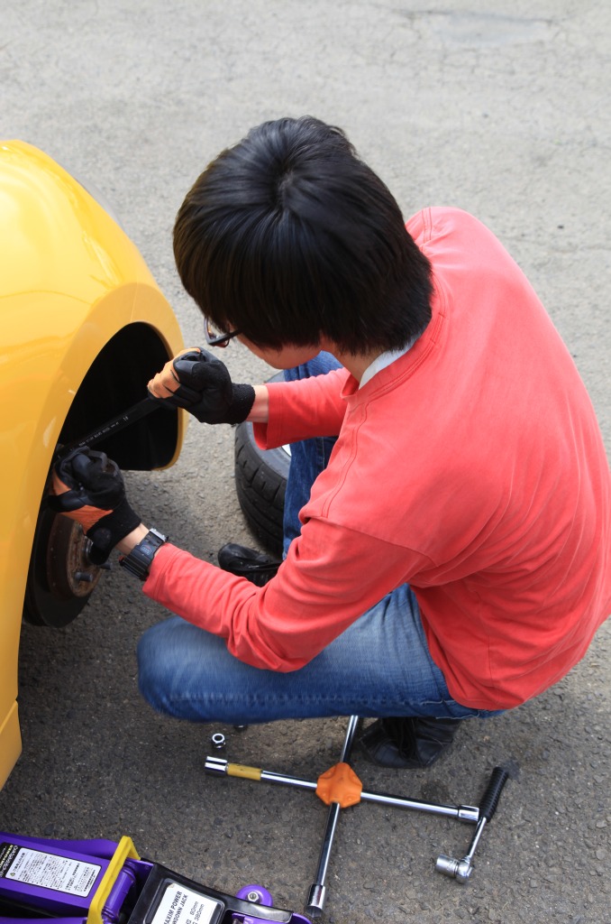 (左)午前中に縁石に激しくヒットしてホイールを曲げちゃったミラ_ミラさん。タイヤ交換のついでにブレーキメンテ中?