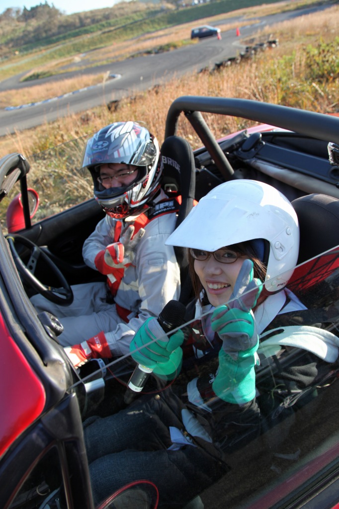 (左)スーパータイムを叩き出したZENさんのNBロードスターの助手席に収まり、何かをつかもうとする?ミラ_ミラさん