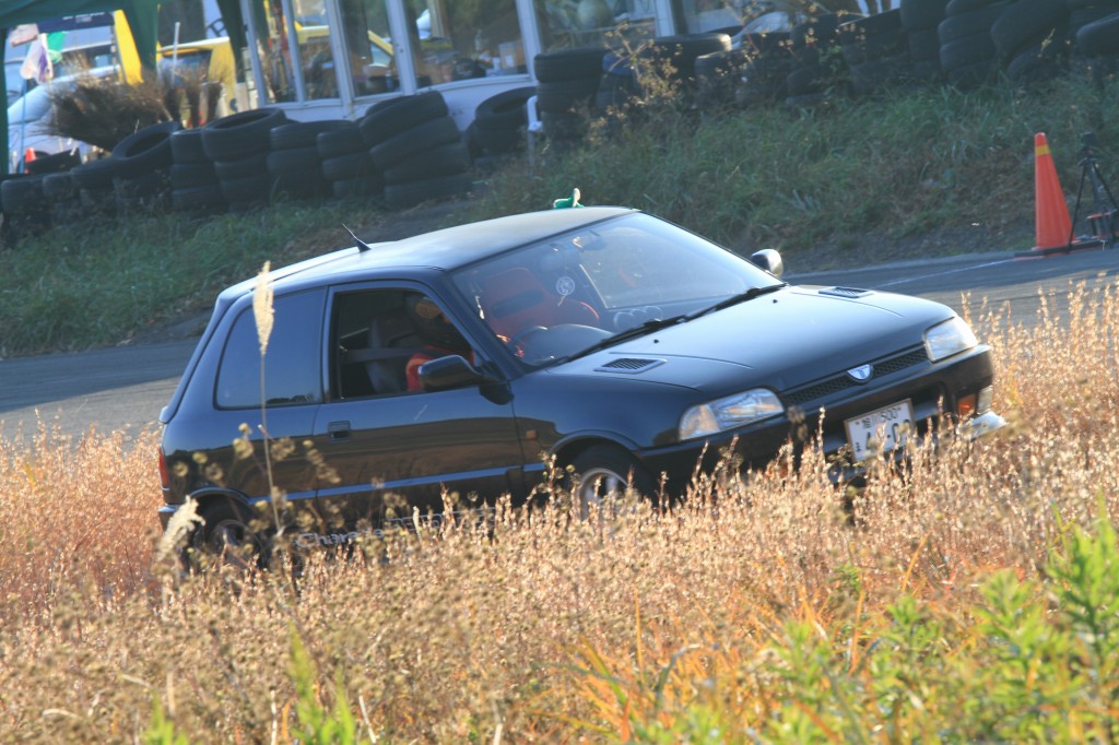 フリー走行の最後を飾ったこはぽんのシャレードはゴール直後にとっちらかって、ダートにズボッ!