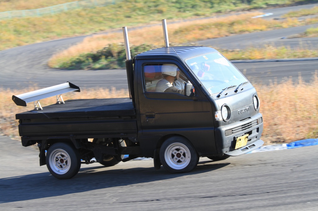 (左)チーム「福島の白い彗星」のサポートカー?スズキのキャリィトラック。ルーフの後ろから天にそびえる2本出しマフラーがカッコイイ!